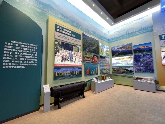 在“坚持推动构建人类命运共同体 开创中国特色大国外交新局面”单元,中老铁路动车交付的图文展板与下方“澜沧号”动车模型相得益彰,正是有了中老铁路,昆明到万象实现了朝发夕至,从此山不再高,水不再长。其他跟云南元素相关的图片、实物也引人驻足,如“七一勋章”获得者张桂梅、云南中老越边境十层大山界碑处的泥土、昆明宣言等。