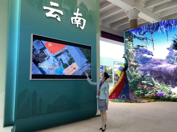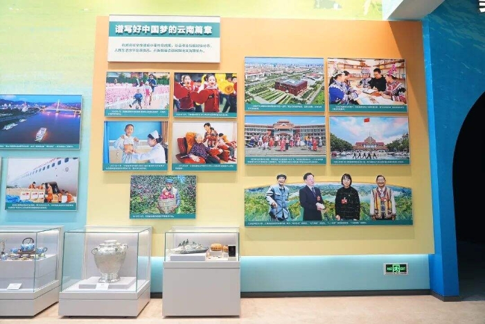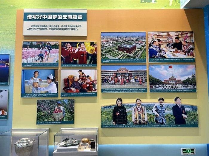 云南单元第一部分集中展示云南大力推进高质量跨越式发展,经济社会发展取得显著成效,边疆治理体系和治理能力现代化水平持续提升,各族人民群众的获得感、幸福感、安全感不断增强。十年间,云南脱贫攻坚取得全面胜利,933万农村贫困人口全面脱贫,经济总量实现翻番,绿色能源产业大踏步前进,高原特色农业一路高歌,文旅产业转型升级,城乡面貌焕然一新,各地发展日新月异。