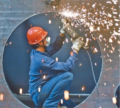 河南省洛阳市,工人在中信重工车间清理打磨出口的矿用磨机筒体。近年来,该公司在矿业及水泥重型装备制造领域深耕,市场影响力不断提升,在“一带一路”沿线订单稳步增加。黄政伟摄(影像中国)