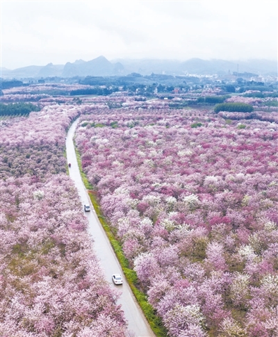 近年来,广西壮族自治区柳州市柳北区大力发展花卉苗木产业,发展“花经济”的同时,美化乡村环境。图为柳北区大仙村,车辆从盛开的洋紫荆苗木林间驶过。黎寒池摄(人民视觉)