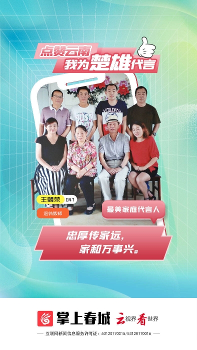 7月22日,2022年云南·昆明网络文化节系列活动“点赞云南 我为家乡代言”手机形象网络征集活动正式启动,面向全省征集典型人物故事,让一个个普通网民成为主角,登上封面为家乡代言,讲云南故事,展云南形象。 活动吸引了市民朋友的广泛关注,自启动以来持续火爆,每天均收到大量投稿,今天登上封面的就是由中共楚雄彝族自治州委网信办推荐的“最美家庭”代言人王朝荣。