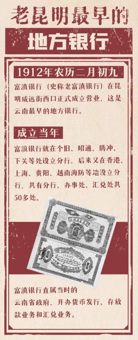 昆明重九起义胜利后不久,云南军都督蔡锷就下令筹设地方银行机构,负责发行新政权的货币。经过紧张的筹备,1912年农历二月初九,富滇银行(史称老富滇银行)在昆明威远街西口正式成立营业,这是云南最早的地方银行。成立当年,富滇银行就在个旧、昭通、腾冲、下关等处设立分行,后来又在香港、上海、贵阳、越南海防等地设立分行,共有分行、办事处、汇兑处共50多处,标志着覆盖全省,联结香港、上海等地的云南地方现代金融体系的建立,对地方的金融、时政和经济稳定、有效抵御殖民势力侵入发挥了重要的作用。辛亥革命时期,云南政治、经济治理成为“南北各省之冠”,富滇银行功不可没。