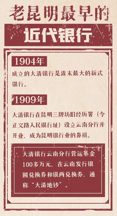 1904年成立的大清银行是清末最大的新式银行,履行国家银行的职责。1909年,大清银行在昆明三牌坊旧经历署(今正义路人民银行址)设立云南分行并开业,成为昆明银行业的鼻祖。
