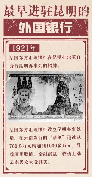 据统计,法国东方汇理银行设立昆明办事处后,在云南发行的“法纸”迅速从700多万元增加到1000多万元,按当时的比值换算,竟然相当于富滇银行发行的滇币总额的175%。结果是滇币贬值,金融混乱,物价上涨,汇理银行大发其财,而云南民众大受其害。