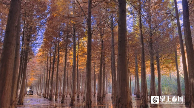 被红色浸染的叶子像幻影一样依附着纤细高挑的树干,一排排水杉林立在水中,倒映格外美丽。