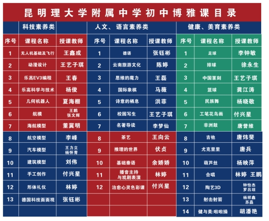 为促进学生的全面发展,切实提升学生的综合素养,昆明理工大学附属中学依托昆明理工大学深厚学养,结合自身实际情况,创建了三级课程体系。即:国家地方课程、学生特长博雅课程、学生生涯规划课程。三级课程循序渐进,干强枝茂,为附中学生的全面发展奠定了坚实的基础。