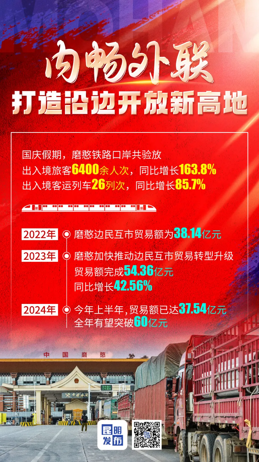 9月24日,首趟中老泰多式联运“一单制”货运列车从昆明发车;同日,“星光·澜湄号”中老铁路跨境旅游列车在昆明站首发,标志着中老铁路跨境列车旅游产品正式落地;10月14日,中老铁路国际冷链班列暨“京滇·澜湄线”国际货运列车正式开行……中老铁路这条“黄金大通道”还在不断上新,“中欧、沪滇、湘滇、云贵、粤滇、京滇”澜湄线等国际货运班列的开行,使磨憨快速成为连接中国与东南亚国家的“黄金口岸”,这个沿边开放新高地正把开放之路越走越宽。