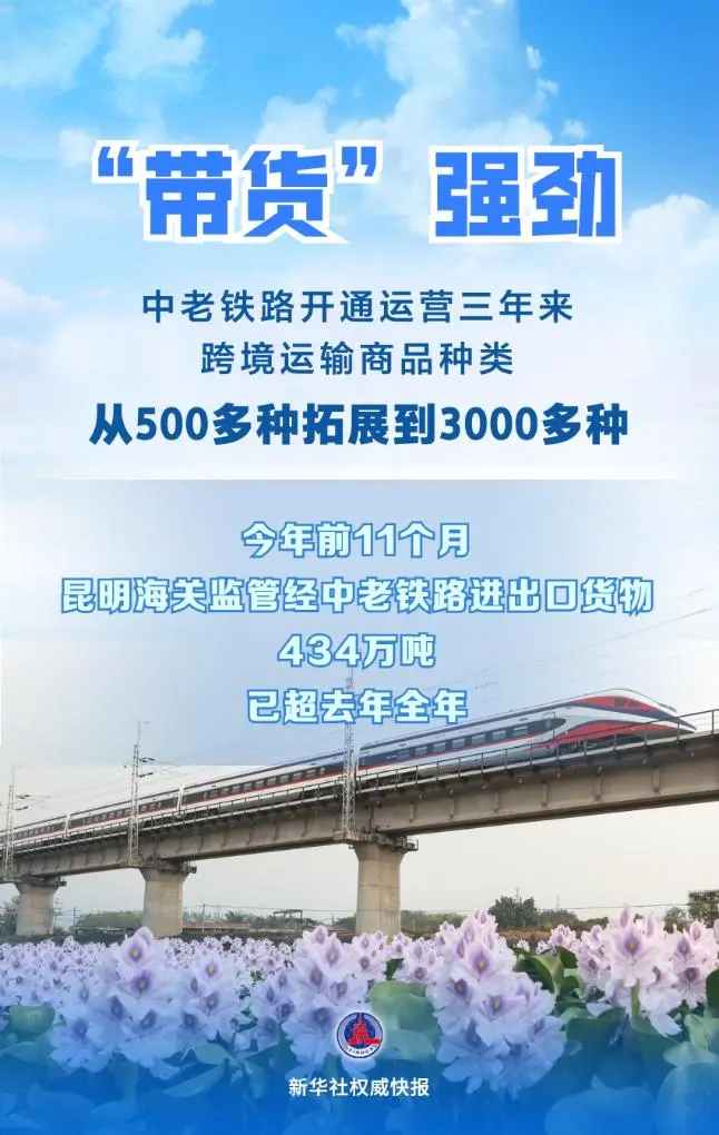 中老铁路3日迎来开通运营三周年。昆明海关当天发布数据显示,三年来,中老铁路跨境运输商品种类已从最初的500多种拓展到现在的3000多种;今年前11个月,昆明海关监管经中老铁路进出口货物434万吨、货值168.1亿元,均已超去年全年。