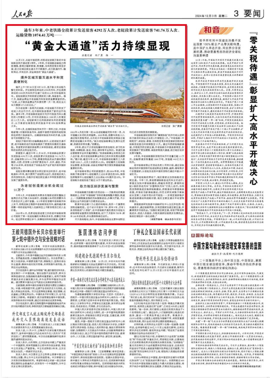 2021年12月3日,连接昆明和万象、全线采用中国标准的中老铁路全线开通运营。自此,老挝迈入铁路运输时代。2024年12月3日,中老铁路实现开通运营三周年。3年来,作为“一带一路”、中老友谊标志性工程,中老铁路为加快建成中老经济走廊、构建中老命运共同体提供了有力支撑,“黄金大通道”作用日益显现。
