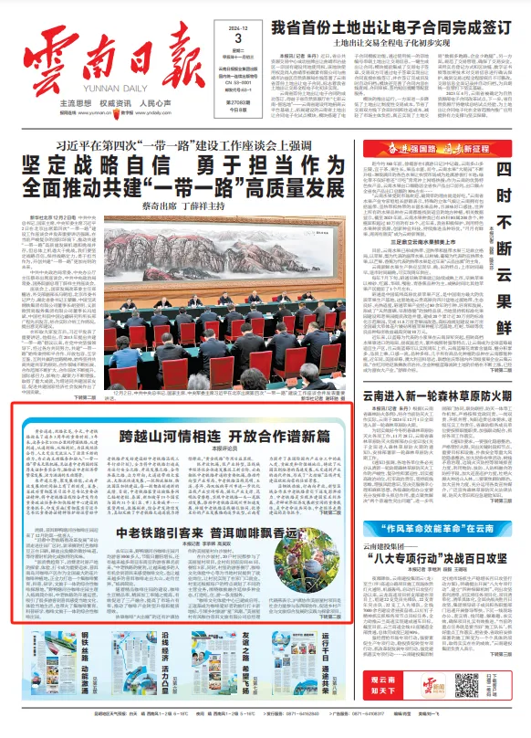 黄金通道,丝路长龙。今天,中老铁路迎来了通车3周年的重要时刻。3年来,这条全长1035公里的跨国铁路,从建到通,从通到畅,从畅到忙,为区域经济合作、人文交往交流注入了源源不断的动力,为云南主动服务和融入“一带一路”带来无限机遇,见证着中老两国的深厚友谊和务实合作,描绘出中老经济带繁荣发展、活力满满的生动图景。