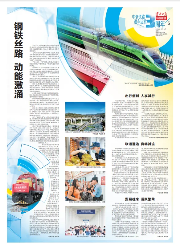 3年来,中老铁路跑出了“加速度”、增添了“新动力”、打开了“新篇章”。单日旅客发送量由2万增至最高10万人次;单日跨境货物列车从日均2列增至20列;出入境人员来源地从最初的20多个国家和地区增长到100个国家和地区;货物品类从10多种增至3000余种;在中老铁路的助推下,2024年上半年,中国与湄公河五国贸易突破2000亿美元,比10年前翻了一番,再创新高。