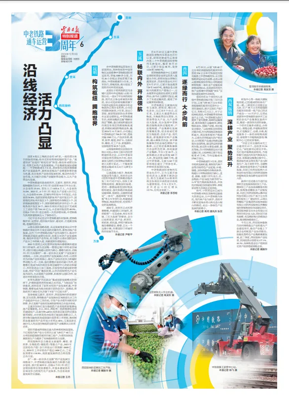 “中老铁路向北与中国铁路网连通,再由中国铁路网通过中欧班列辐射至俄罗斯,最远可达德国、西班牙等国家;向南与泰国米轨网连通,到达南部港口,直至柬埔寨、马来西亚和新加坡。”国铁昆明局货运部主任赵雁峰介绍,3年来,中老两国间的货运时间和物流成本大幅下降,带动沿线产业热潮涌动。