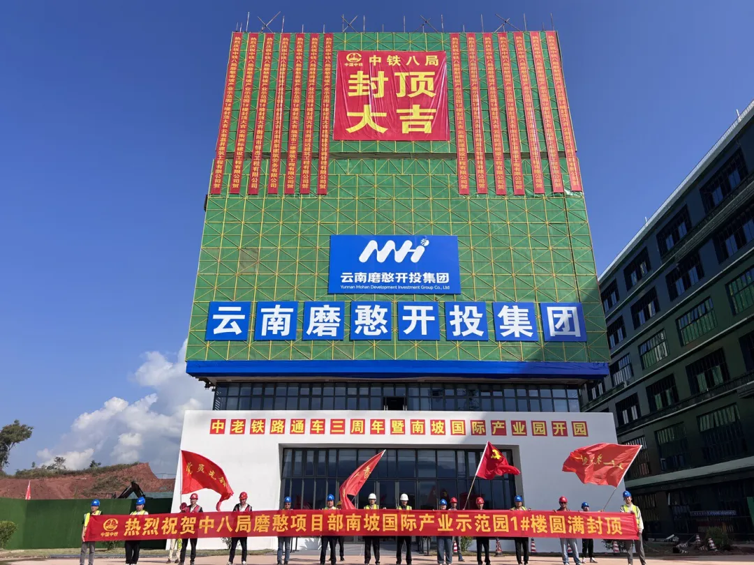 近日,随着最后一块顶板浇筑完成,由中铁八局承建的磨憨南坡国际产业示范园项目1号楼研发中心顺利封顶,标志着该项目已进入内部结构施工阶段。