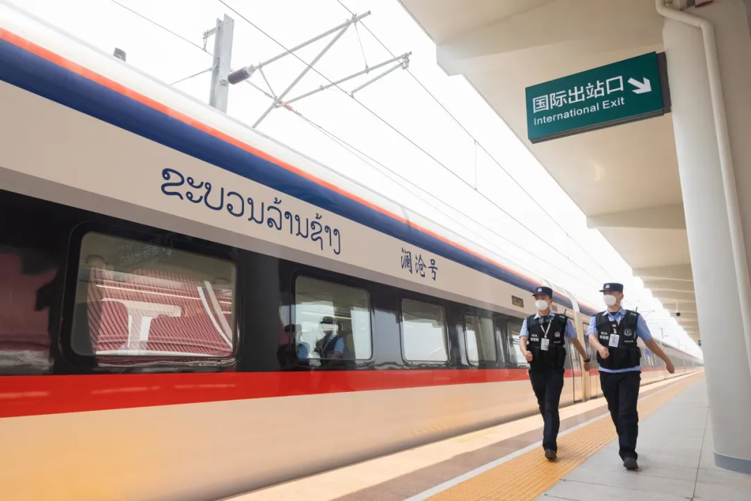 磨憨边检站移民管理警察监护“澜沧号”国际旅客列车。图源国家移民管理局