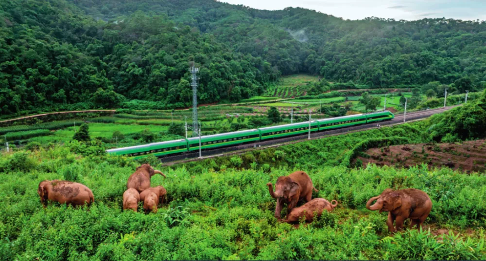 “然然家族”和“短鼻家族”象群在云南省西双版纳傣族自治州景洪市大渡岗乡活动时,一列复兴号列车从中老铁路上驶过。胡超/摄