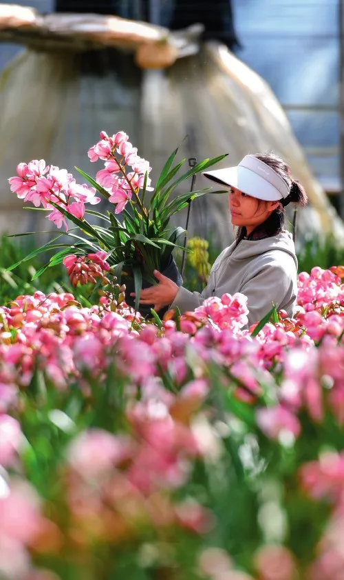 在昆明金才农业科技有限公司种植基地,工作人员在查看大花蕙兰生长情况。彭奕凯/摄