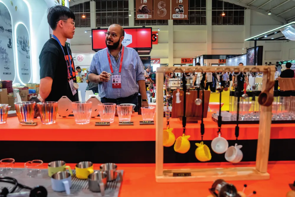 在南博会咖啡产业馆,一名外国嘉宾向展商咨询咖啡冲泡器具。胡超/摄