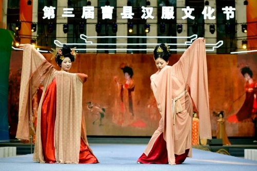 ▲在曹县e裳小镇数字经济产业园,模特在曹县汉服2025春夏新品发布会上走秀(4月10日摄)。新华社记者 郭绪雷摄