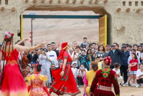 ▲5月4日,游客在新疆鄯善县吐峪沟景区欣赏民族歌舞表演。新华社记者 王菲摄