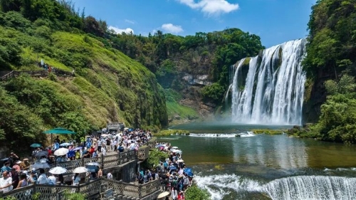 ▲ 5月4日,游客在贵州省安顺市黄果树瀑布景区游览。新华社发 陈熙摄