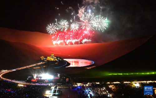 ▲ 游客在甘肃省敦煌市鸣沙山月牙泉景区观看烟花。新华社发 张晓亮摄