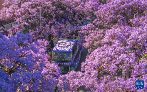 ▲ 在云南省昆明市五华区教场中路,游客们乘坐蓝花楹主题观光巴士,欣赏蓝花楹盛开景色。新华社发 宋光旭摄