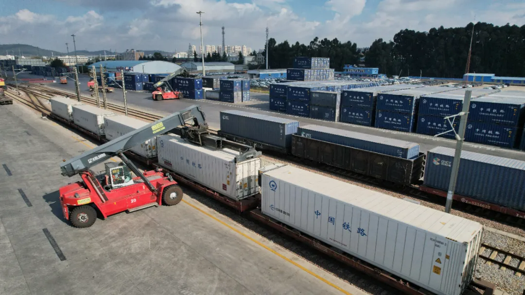 到达中铁联集昆明集装箱中心站的澜湄快线国际货物列车正在组织卸车,白色集装箱内满载来自泰国等地的榴莲。国铁昆明局供图