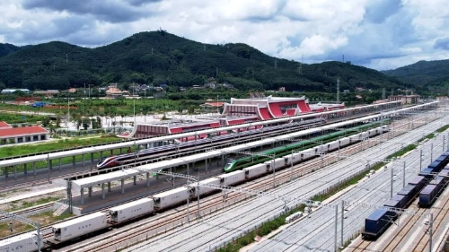 “复兴号”“澜沧号”动车组在磨憨站“相遇”。