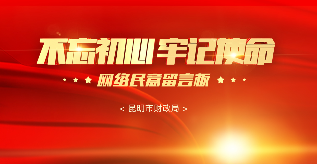 即日起,“昆明市财政局”网站开设了主题教育民意留言板,全市广大党员群众可以积极留言反映,我们会将您的留言实时反映到市财政局“不忘初心、牢记使命”主题教育领导小组办公室。