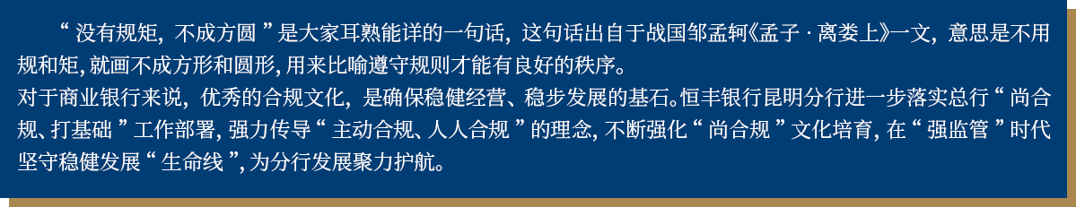 恒丰银行昆明分行在云岭的十年,也是分行逐渐巩固合规价值观核心地位的十年。在党建引领下,分行贯彻落实监管机构和总行的各项制度规定,结合“进一步深化整治银行业市场乱象”工作要求,持续开展“尚合规”建设。