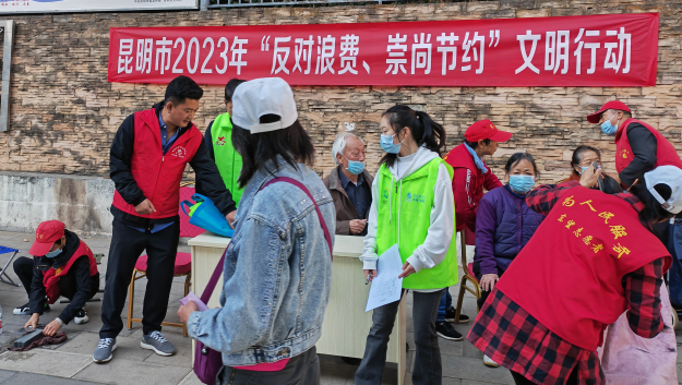 3月28日,昆明市民政局在月家社区开展“反对浪费、崇尚节约”文明行动,积极倡导婚事新办、丧事简办。