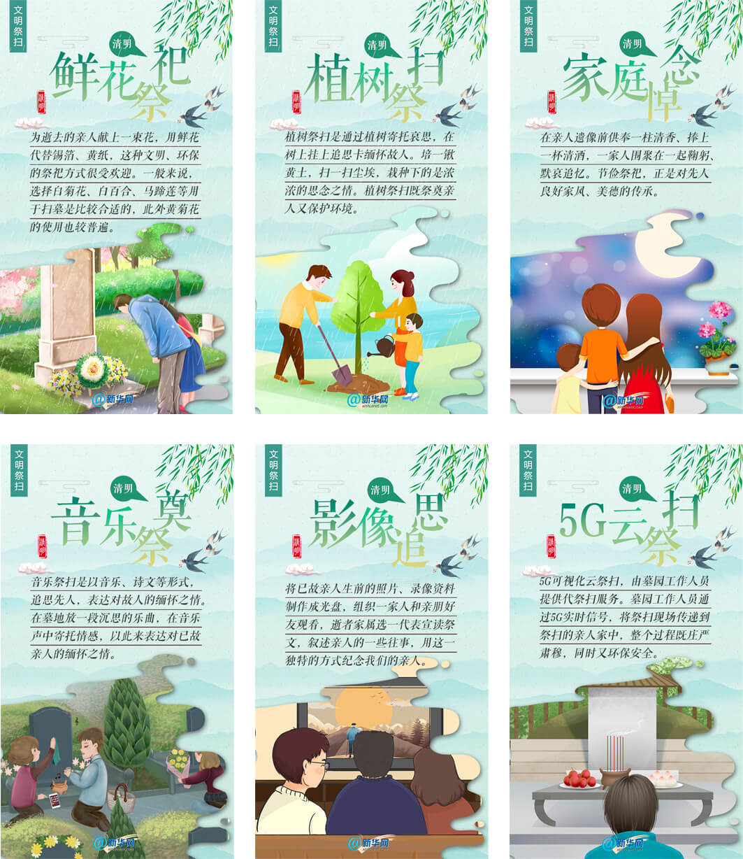 倡导健康祭扫。缅怀先人,重于心不拘于形。倡导通过举办家庭追思会、撰写缅怀文章、种植花草树木和代理祭扫、网上祭祀等文明祭祀方式,怀念逝者、寄托哀思。