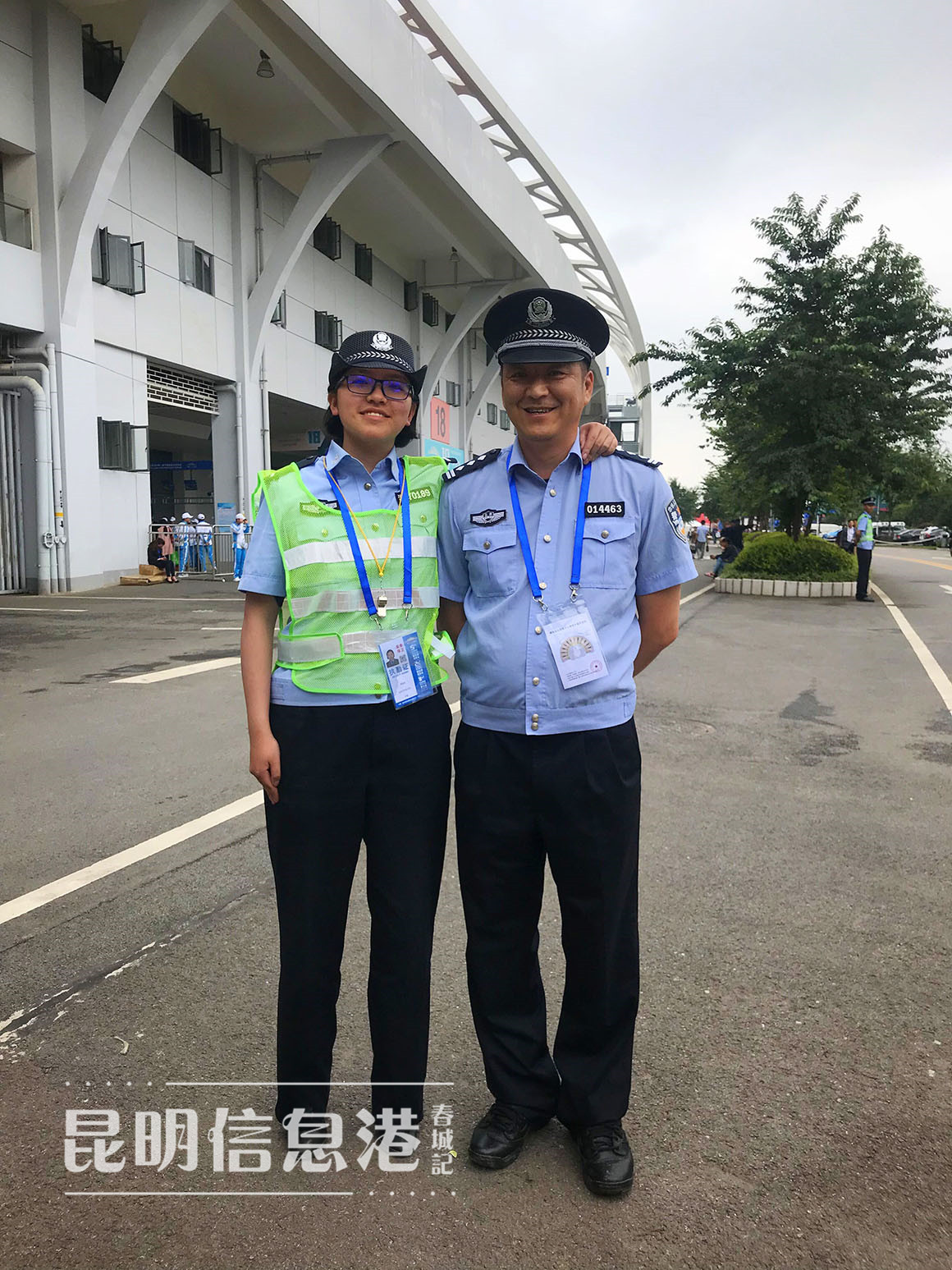 “父(子)女兵”齐上阵共保平安在会场也不少见。盘龙公安分局巡特警大队的大队长洪跃及其18岁的女儿便是其中一组父女兵。浓眉大眼的洪跃身高一米八几,穿起制服,敛起笑容浑身就能散发出冷静、严肃的气场。16日正午时分,洪跃身体微微前倾,背起双手看着不远处,眼里散发出了浓浓的慈爱,眼角的皱纹也弯成了温柔的弧度,他在偷偷看着自己的女儿——李宜珂。