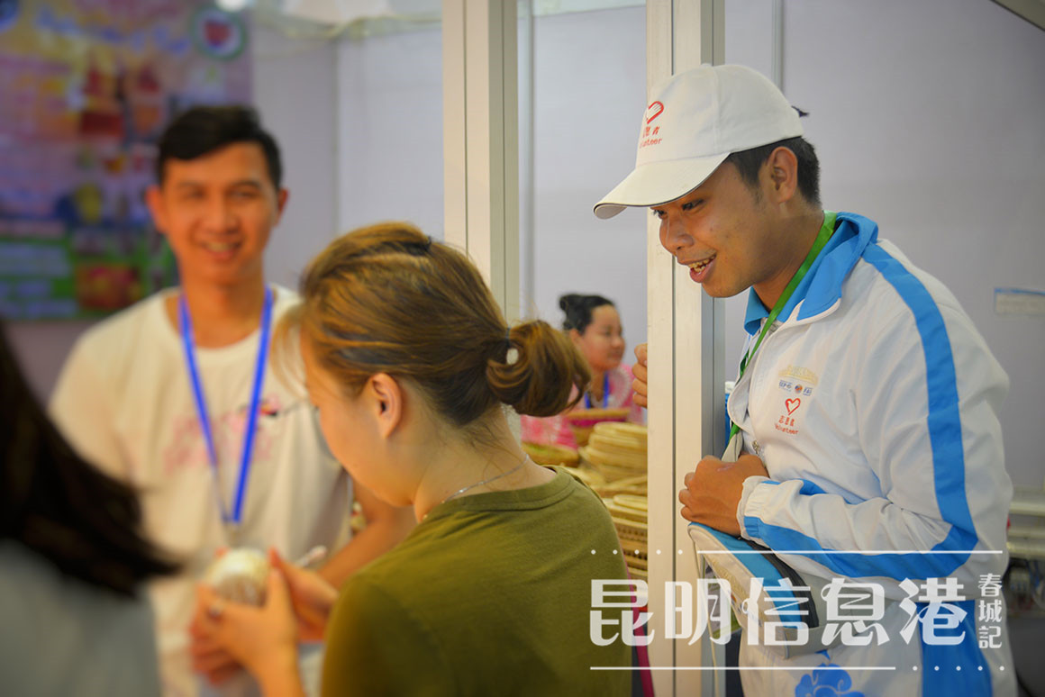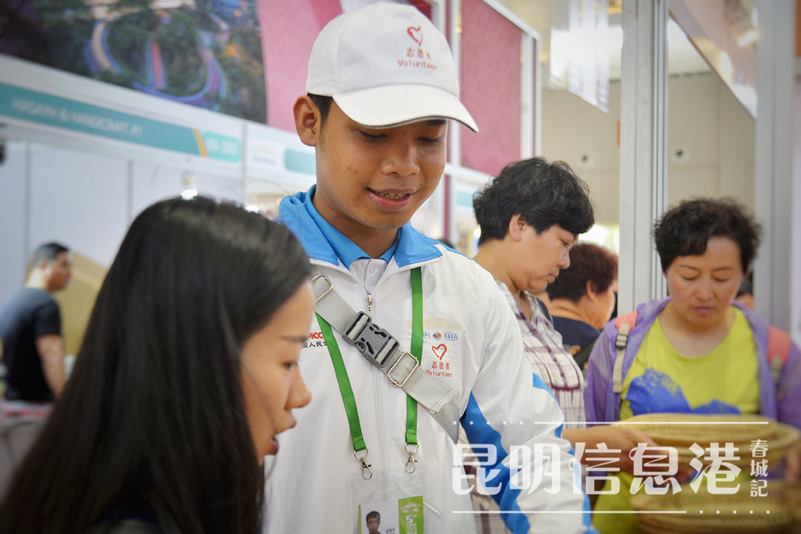 在参展商与市民愉快买卖的同时,有这么一群人,他们头顶白色球帽,身着蓝白相间的运动服,挎一个灰色腰包,每天穿梭在熙熙攘攘的人群中,为参展市民与南博会的沟通搭建桥梁。他们有一个共同的名字——志愿者。来自柬埔寨的孔星驰(Khemra Ratanak)便是其中一朵“小白云”。