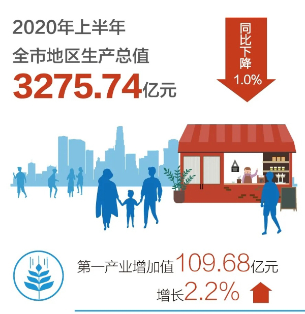 2020上半年全市地区生产总值3275.74亿元,第一产业增加值109.68亿元,增长2.2%,第二产业增加值975.99亿元,下降1.7%,第三产业增加值2190.07亿元,下降0.7%。