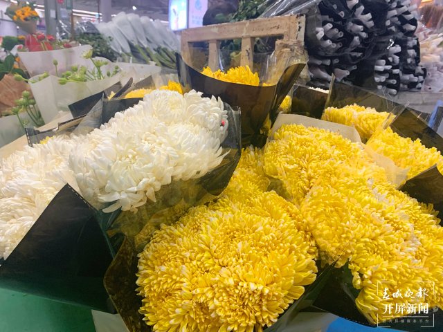 3月31日,春城晚报-开屏新闻记者走访昆明斗南花卉市场,看到许多花商都把黄、白菊花放在了显眼的位置,鲜花批发基地直供的摊位上也堆满了菊花。