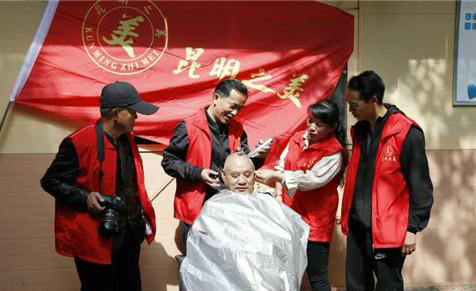10月17日,昆明之美志愿者顾中国、李厚基、艾庆玮、李俊萍、李芸等到五华区学府社区居家养老服务中心,为老人理发,陪老人过敬老节。昆明之美志愿者用自身行动践行社会主义核心价值观。