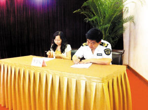 市食药监局负责人与餐厅负责人签订食品安全责任书。