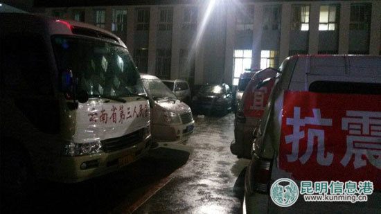 昆明信息港讯 记者沈莹 云南省第三人民医院21:40出发前往震区,于4日凌晨3:00到达鲁甸县医院,在短暂的补给后,前往距离鲁甸县20多公里的灾区龙头山乡投入救援。
