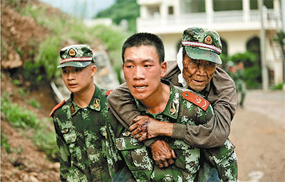 8月3日,武警官兵在云南鲁甸县援救伤员。新华社 记者张广玉/摄