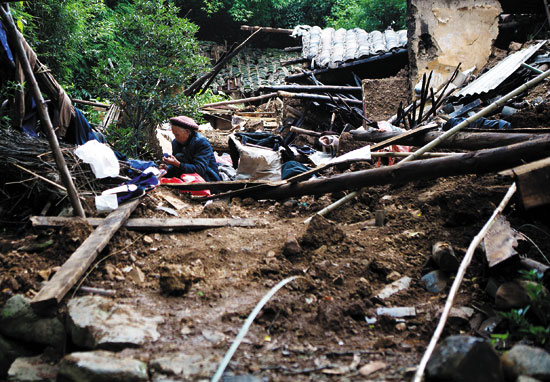 罗以成、雷选美终于在8月4日下午4点到家,还从县城里带回了两张大篷布——帐篷还没有送进房屋几乎全部倒塌的罗家院子社。他们看到老公公罗发云躺在竹林里的木板上。