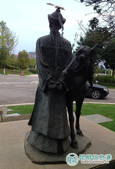 经过了1小时37分的徒步,终于到达市政府,市政府4栋的对面立着这么一副人马的雕像,我跑到了人的后面只为了拍马的表情,而在人的面前,我们只能看到马瘦骨嶙峋的屁股,尽管瘦,但我不愿拍。 说起钱沣钱南园,可能很多人不知道他,如果活在当下,应该是习大大的得力助手。他是云南昆明人,清乾隆进士,官至国使馆修纂、监察御史。一生清廉,刚正不阿,慷慨感言。以参劾贪官大学士和珅、陕西巡抚毕源、山东巡抚国泰而闻名天下。 钱沣还是享誉全国的书法大家,书法宗唐颜真卿,善画马,尤爱画瘦马,故有瘦马御史之誉。现有反腐倡廉的京剧《瘦马御史》。这样的历史人物,出现在昆明市政府,是呈贡百姓之福,或许比瓦猫更能镇宅辟邪吧。这应该是现代公务员的信仰,值得弘扬。