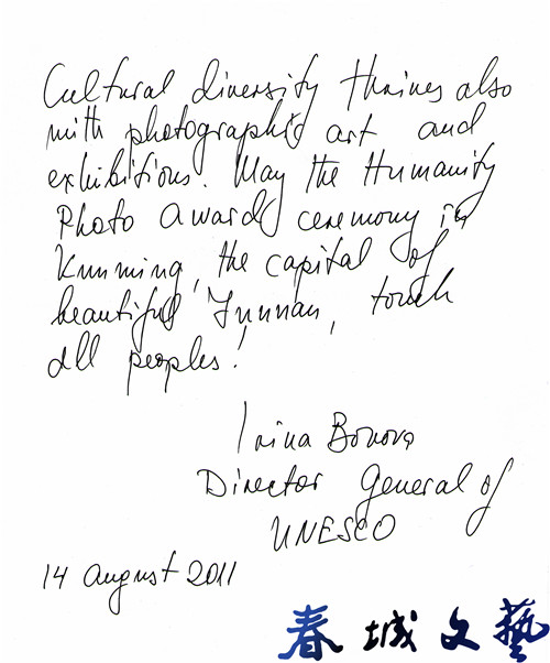 联合国教科文组织总干事博科娃为此题词:摄影推动文化多样性的繁荣发展,愿在美丽的云南昆明举办的人类贡献奖颁奖。
