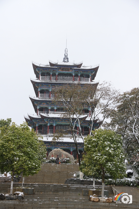 图片说明:雪景中仰望三台山公园东骧阁的父子。拍于三台山公园,对于四季如春的呈贡来说,要见到下雪不容易,而要见到银装素裹的景色更不容易。展示在美丽的雪景下呈贡人最真实、最朴素的生活面貌。