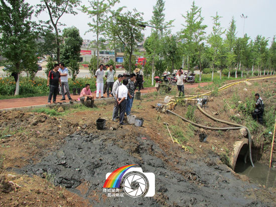 图片说明:2014年5月12日,三岔口社区驼峰街旁,街道组织三岔口社区干部开展汛前防汛清淤工作。