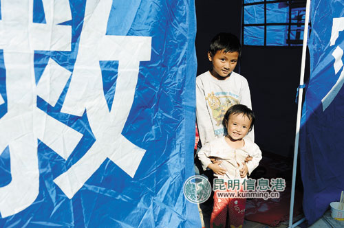 两名孩子在临时安置点的帐篷内玩耍 新华社/图