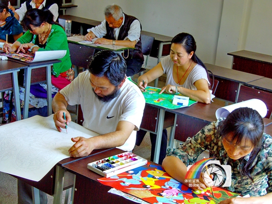 图片说明:中国农民画之乡的呈贡农民作者在作画。