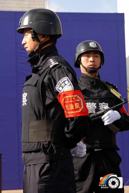 图片说明:庄严宣判在文化广场举行,现场法警展示出执法如山之架式。