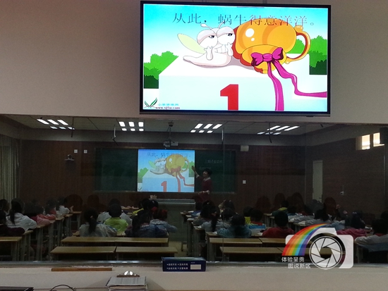 图片说明:这是呈贡实验学校录播室上课的一个镜头。录播室教学是呈贡目前较先进的一种教学设备,上课的师生在教室里上自己的课,听课者则在另外一间教室里边听边看录像,互不干扰,这是呈贡区在教育硬件建设投入较为领先的一面。