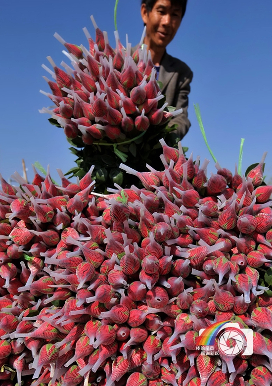 图片说明:一名呈贡花农在摆放玫瑰花。